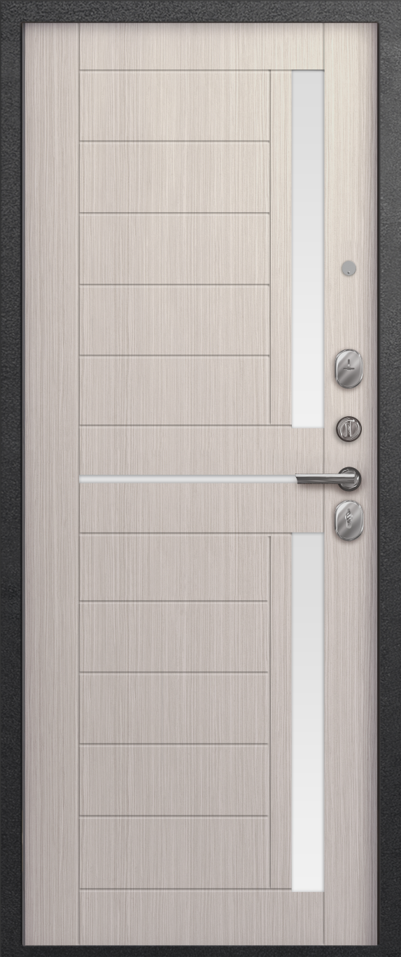 Два контура уплотнения с трехкамерным уплотнителем надежно защищают от сквозняков и посторонних запахов. Замки Sezam 103 и 102 в сочетании с эксцентриком (регулятором притвора), цилиндрами (ключ-вертушка и ключ-ключ) и броненакладкой на цилиндр обеспечивают высокий уровень защиты от несанкционированного проникновения. Дополнительная ночная задвижка повышает безопасность, а раздельная ручка и глазок добавляют удобства в использовании. Противосъемные штыри и две петли обеспечивают дополнительную защиту от взлома.